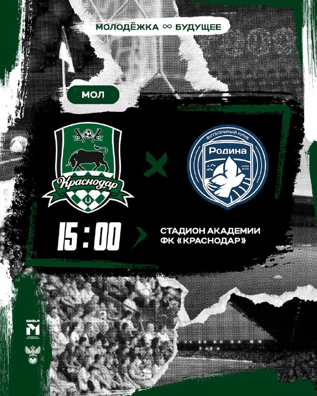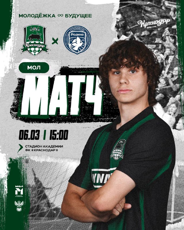 День матча! Начинаем новый путь в Молодёжной лиге ♾️ 📆 6 марта ⌚️ 15:00 ⚽️ «Краснодар»-М – «Родина»-М (Москва) 🗺 Краснодар 🏟 Стадион Академии ФК «Краснодар» 🖥 VK Видео