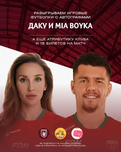 🔥 Разыгрываем две игровые футболки «Рубина» с автографами Даку и Mia Boyka А также подарим нескольким счастливчикам клубные шарф с шапкой и 15 билетов на предстоящий матч с «Локомотивом» 15 марта 🎟