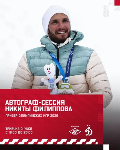 ⚡️ Призер Олимпийских игр 2026 года — Никита Филиппов — на «ЛУКОЙЛ АРЕНЕ»! Давний болельщик «Спартака» проведет автограф-сессию в подтрибунном помещении D (низ). Приходите взять автограф и сделать ф