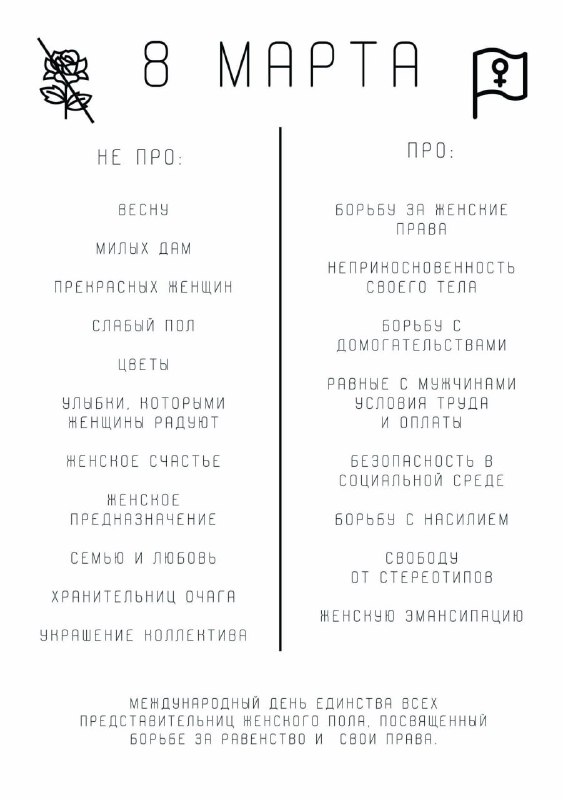 Сейчас, за несколько часов до 8 марта, когда на женщин обрушится вакханалия поздравительных стихов, жутковатых картинок и странных пожеланий мне хочется написать такой дисклеймер для мира. Если вам х