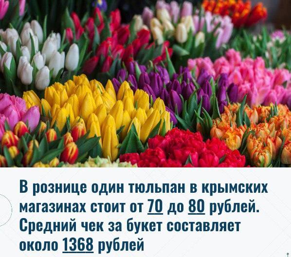 🌷 Тюльпаны в Крыму подорожали к 8 марта — цены выше, чем в среднем по России В Крыму стартовал сезон продаж тюльпанов в преддверии 8 марта. По данным аналитиков цветочного рынка, стоимость главного