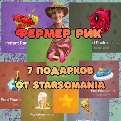 РОЗЫГРЫШ NFT ГИФТОВ Starsomania ⭐️ х Фермер Рик 👨🌾 7️⃣NFT подарочков для вас, махонькие: 🎁 Timeless Book 🎁 Mood Pack 🎁 Instant Ramen 🎁 Pool Float 🎁 Pool Float 🎁 Vice Cream 🎁 Chill Flame
