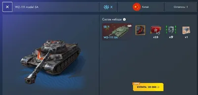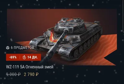 ⚡️На сайт игры завезли набор «WZ-111 5A Огненный змей». Содержимое набора: коллекционный танк WZ-111 5A (Китай, тяжёлый, X уровень) слот в Ангаре 9 слотов оборудования легендарный камуфляж «Огненный