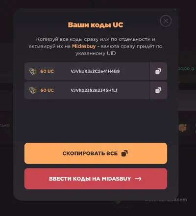 ⚡️2 кода на 60 UC каждый ⚡️ VJVhpX3s2C2e41H4B9 VJVhp23h2n2345HfLf Вводи код на MidasBuy в разделе «выкуп» 💸 😎 Код на 20% к пополнению на Ggstandoff ➡️ ФЕРПАБГ