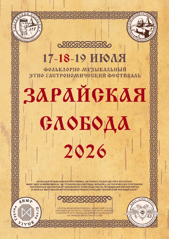 ЗАРАЙСКАЯ СЛОБОДА 2026 17-19 июля Московская область, г. Зарайск, д.Карманово, территория Кремля им. Евпатия Коловрата. 25Га частной территории на изгибе реки Осётр. Участники: На данный момент лайн