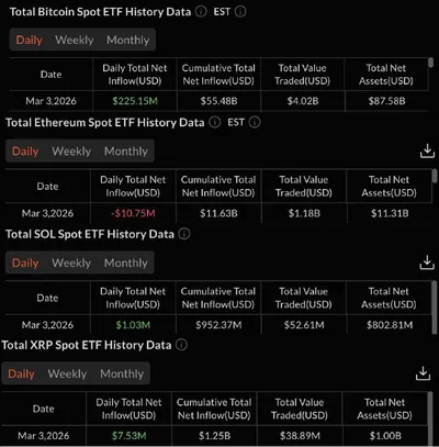 😎 SV: Финпотоки крипто-ETF за вчерашний день. 🟠 BTC = +$225,150,000. ⚪️ ETH = -$10,750,000. 🧬 SOL = +$1,030,000 (15 зеленых дней подряд). ✖️ XRP = +$7,530,000. Представь такой мууд, что ты шортиш