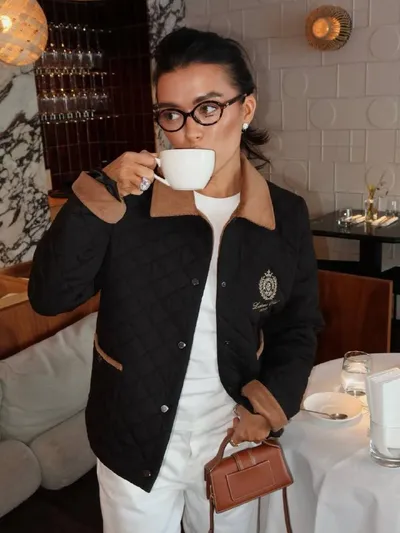 Друг бренда Ангелина Монреальная в стёганной куртке 🤍 Выполнена из плащевой ткани с подкладом и вельветовыми отворотами на рукавах, воротнике и карманах. Прямой крой и четкая структура придают лакон