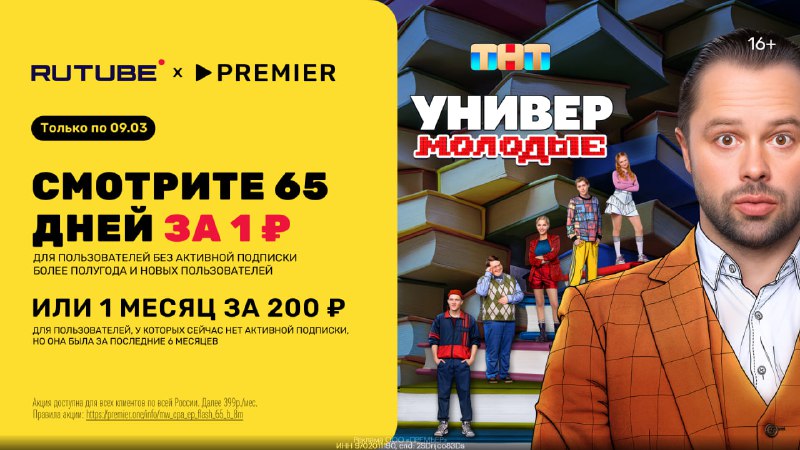 Универ. Молодые (2025) Жанр: комедия RUTUBE х PREMIER — ТОЛЬКО ПО 09.03! Получи 65 дней подписки за 1 ₽ или подписку на 1 месяц за 200₽!https://gtblg.ru/HCV1L?erid=2SDnjco83Ds Код: kinohd65ma