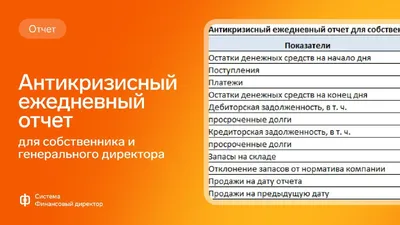⚠️ Антикризисный ежедневный отчет для собственника и генерального директора Антикризисный ежедневный отчет пригодится директору или собственнику, который занимается оперативным управлением. Документ
