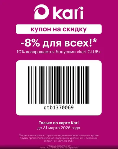 Дополнительная скидка в Kari gtb1370069 – 8% на всё на сайте или в приложении Доступен купон, по которому вы можете получить скидку в оффлайн магазинах Kari. Скидка суммируется с другими акциями и п