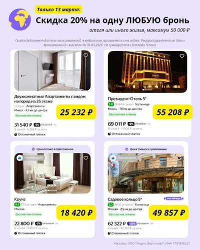 Только 13 марта, бронируйте отель на Яндекс Путешествия с огромной выгодой: ✅ PF-MARCH2O26-PP8QZ — скидка 20% на одно бронирование отеля или иного жилья (максимум 50 000 ₽) Москва: Садовое кольцо 5