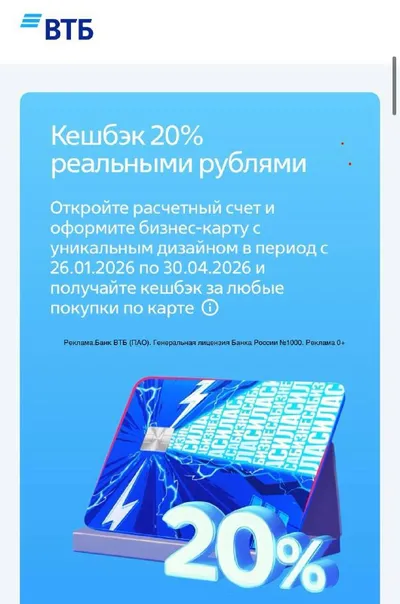 ДО 10 000₽ КЭШБЭКА 20% ПО БИЗНЕС-КАРТЕ ВТБ НА ВСЕ ПОКУПКИ По акции 20% кэшбэк, максимум 10 000₽ за траты на 50 000₽ по бизнес-карте на любые покупки с 26.01 по 30.04.26 по дате списания. Правила.
