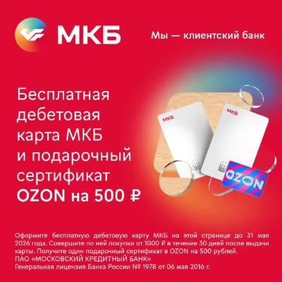 Можно оформить дебетовую карту МКБ с 2 бонусами на выбор: 1) Бесплатное обслуживание + кэшбэк 10%, макс. 1000 б в WB и OZON в первые 30 дней с выдачи. По 31 мая. Правила 2) Бесплатное обслуживание +