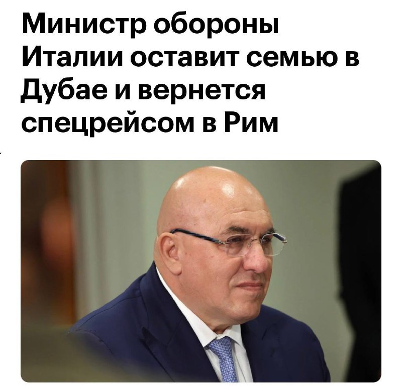 Рубрика «отец года». Министр обороны Италии Гвидо Крозетто бросил семью в Дубае, чтобы улететь специальном военным рейсом в Рим. По словам Крозетто, серьёзных рисков для гражданских лиц в ОАЭ сейчас
