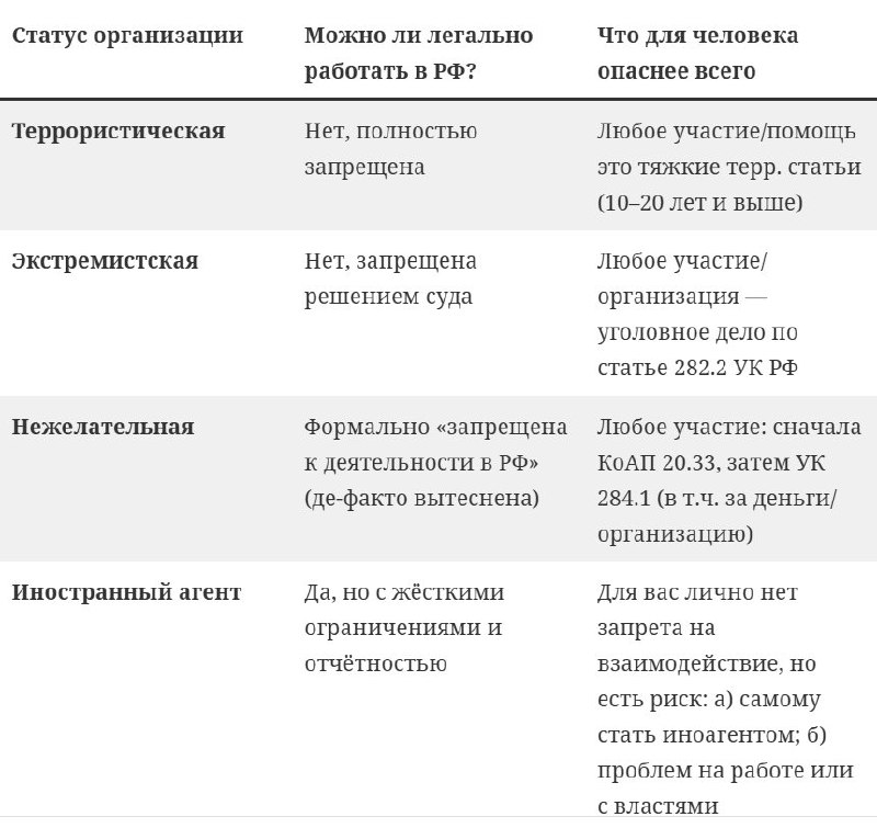 Раз уж я начал уголовно-финансовый ликбез, то вот разница между нехорошими статусами, которые присваивают организациям. «Иностранный агент» для обывательского уха звучит громко (пахнет госизменой),