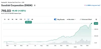 Взлёт акций SanDisk в 15 раз за год — один из самых ярких биржевых сюжетов. После отделения от Western Digital компания снова начала торговаться самостоятельно на Nasdaq под тикером SNDK 24 февраля 20