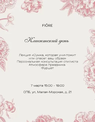 FIŌRE приглашает вас на праздничный клиентский день со стилистом в Санкт-Петербурге. Стилист и фэшн-блогер Анастасия Кошелева проведет для вас лекцию «Сумка, которая уничтожит или спасет ваш образ»