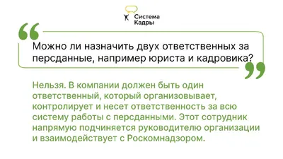 Можно ли назначить двух ответственных за персданные, например юриста и кадровика? 💬 Отвечает экспертная поддержка Система Кадры Нельзя. Но внутри компании вы вправе распределить ответственность по