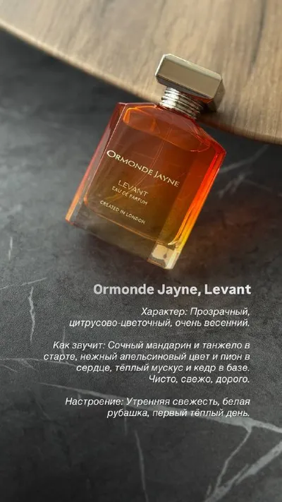 🍊 ORMONDE JAYNE LEVANT Знакомьтесь — Levant от британского бренда Ormonde Jayne. Представьте, ранее утро, когда воздух еще прохладен? Вы очищаете сочный мандарин и к этой цитрусовой свежести примеш