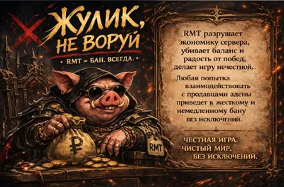 🚫 ЖУЛИК, НЕ ВОРУЙ Мы продолжаем чистку сервера от RMT. Все нарушители получают перманентный бан аккаунтов и HWID без возможности возврата. 🔨 Уже заблокированы игроки, занимавшиеся продажей адены.
