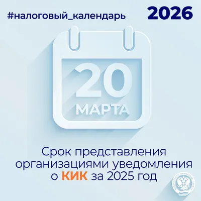 ФНС России (VK) 📆 Напоминаем, что 20 марта истекает срок представления организациями уведомлений (clck.ru/3SJ29Y) о контролируемых иностранных компаниях за 2025 год ✅ Уведомление о КИК необходимо н