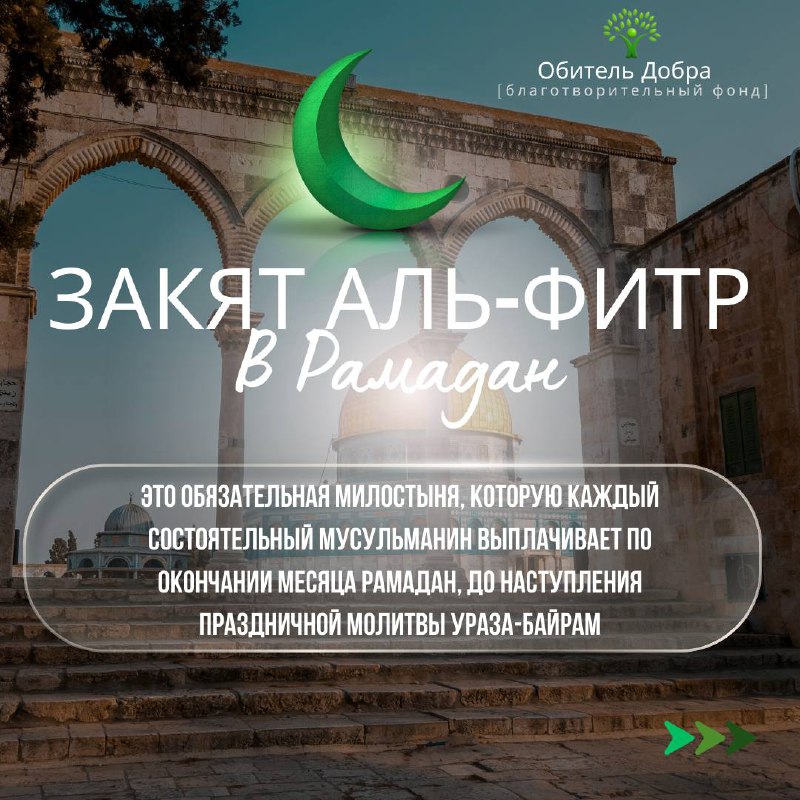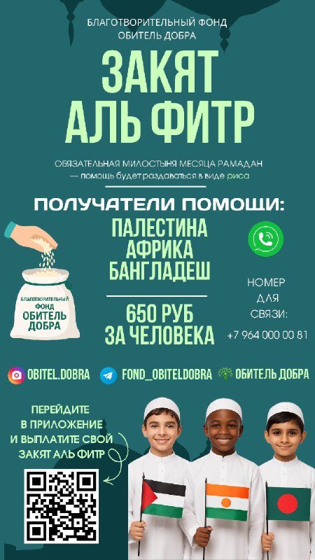 Закят аль-Фитр — 650 ₽ за одного человека В этом году вы можете легко выплатить закят аль-фитр через наше приложение «Обитель Добра». 📱 Скачайте и выполните выплату всего за несколько минут. 💰 Р