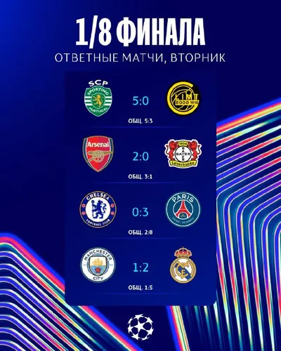 ⚽️ Первые пары 1/4 финала уже известны — это «Спортинг» — «Арсенал» и «Реал» — «Бавария»! «Канониры» не ударили в грязь лицом, но завтра, а точнее сегодня, английским клубам предстоит еще один тяжел