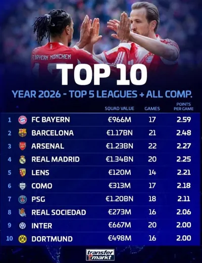 📊 Лучшие команды в 2026 году по среднему набору очков за игру во всех турнирах. 🫥 ФутМания | Футбол