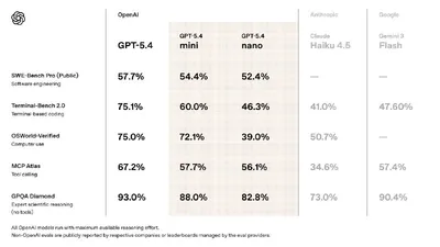 ✴️ OpenAI выпустила GPT-5.4 mini и nano OpenAI представила GPT-5.4 mini и GPT-5.4 nano — облегчённые версии флагманской линейки, оптимизированные под кодинг, субагентов и автоматизацию задач. Главны