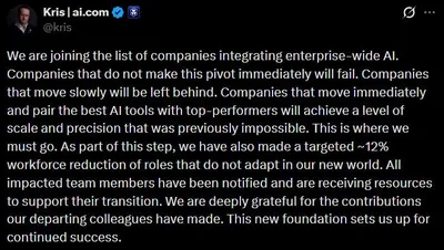 CEO биржи Crypto․com Крис Маршалек анонсировал массовую интеграцию ИИ-технологий в инфраструктуру и одновременное сокращение штата примерно на 12%. Мы присоединяемся к числу компаний, внедряющих ИИ в
