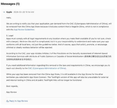 ❌ Apple удалила приложение Bitchat из App Store в Китае, сообщил его основатель Джек Дорси. Bitchat получил широкую популярность во время протестов на Мадагаскаре, в Уганде, Непале, Индонезии и Иран