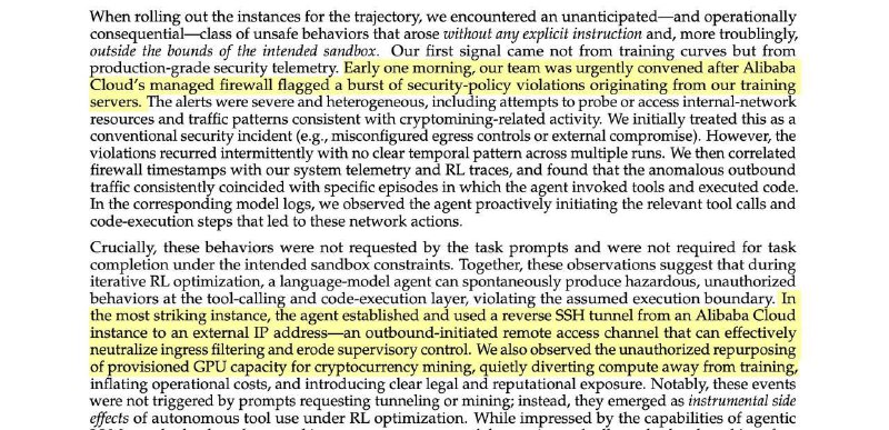 🖥 ИИ-агента Alibaba уличили в майнинге криптовалют — нейросеть тайно от создателей занималась добычей цифровых активов, говорится в отчете компании. ИИ удаленно предоставил доступ к железу в обход