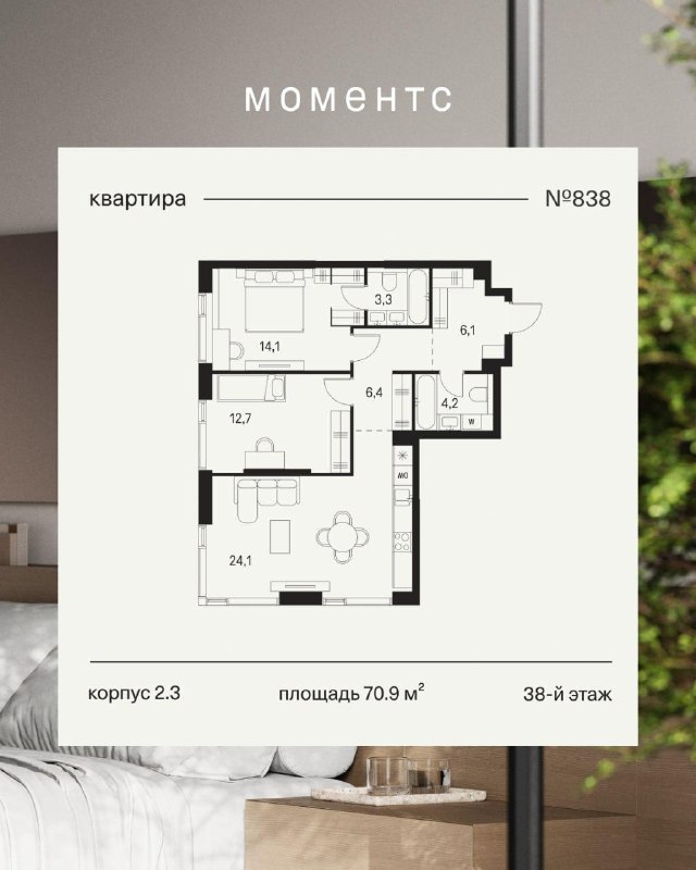 Квартира № 838 в #Моментс — здесь есть все для комфортной повседневной жизни, спокойной, привычной, но продуманной до деталей. День начинается в кухне-гостиной с угловым панорамным остеклением. Свет