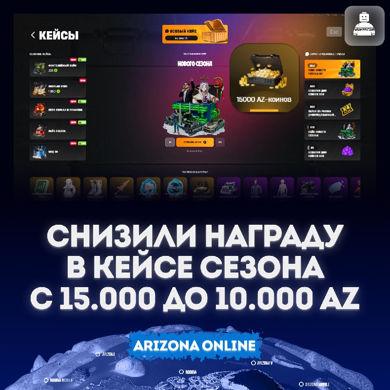 ⚡️ В кейсе нового сезона снизили награду c 15.000 AZ до 10.000 AZ! Правки уже внесли, а информацию в интерфейсе в ближайшее время поправят Arizona ❤️ Предложить новость