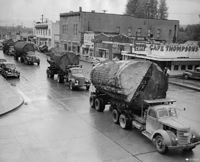 Грузовики с брёвнами в Норт-Бенд, округ Кинг, штат Вашингтон, 1943 год. 👋👋👉 ⬇️ 📁 фото | история