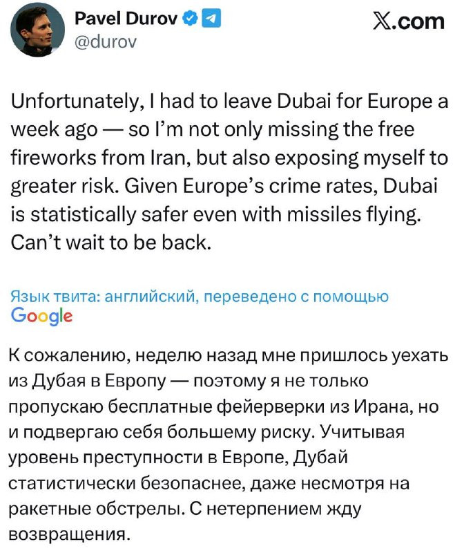 Дуров пожаловался, что вынужден находиться сейчас в Европе, а не в Дубае, и заявил, что в ОАЭ сейчас все еще безопаснее, чем в ЕС.@fourbes