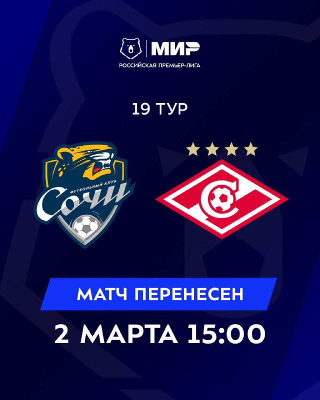 Матч «Сочи» - «Спартак» перенесен на 2 марта на 14:00 Прямая трансляция на телеканале «Матч Премьер».