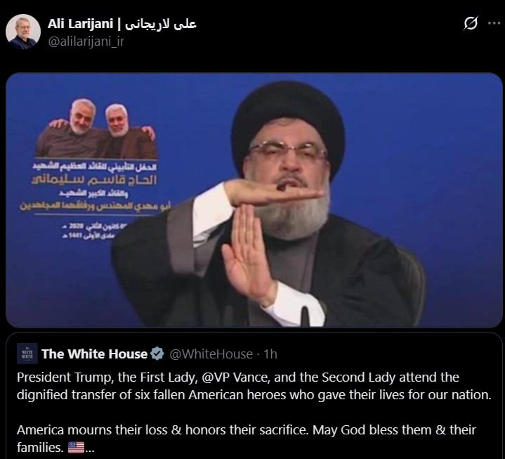 🇺🇸🇮🇷⚡️- Ali Larijani, Secretary of Iran’s National Security Council, responded to a White House tweet honoring the six fallen U.S. soldiers in Kuwait by posting a photo of Nasrallah.