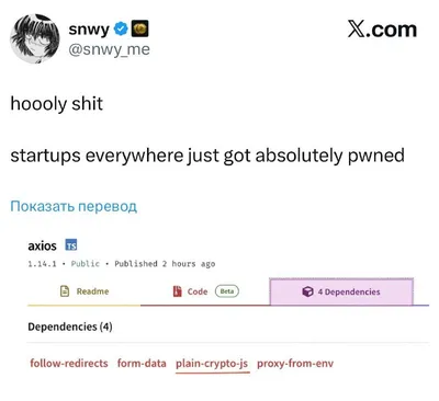 😱 Обнаружена supply chain атака на axios — один из самых популярных пакетов npm В версии axios 1.14.1 подтянулась зависимость plain-crypto-js, которой раньше не было. Анализ показал, что это загруз