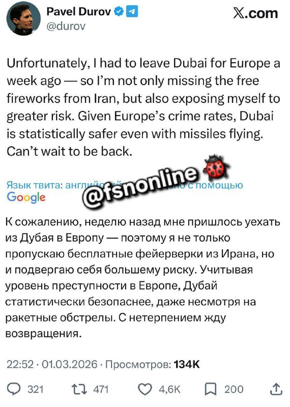 Пабло Дьюров заявил, что покинул Дубайск и уехал в Гейропу 😎 При этом, Дьюров заявил, что с нетерпением ждем возвращения назад — он считает, что с нынешним уровнем преступности в Дубайске даже на фо