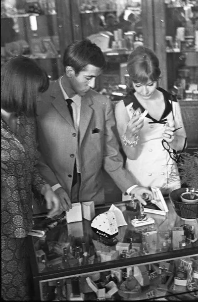 Красивое вечернее. Гости VI Московского международного кинофестиваля в отделе парфюмерии. На переднем плане выделяется коробка духов Agats от Dzintars. Фотограф Эдуард Козадаев. Июль 1969 года.