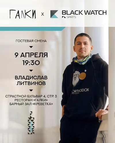 Галки × Black Watch 9 апреля в 19:30 в «Галках» — гостевая смена от Владислава Литвинова. Команда Black Watch привезёт свой почерк, а мы добавим дух Галок — общение, шум и немного магии. Успей поп