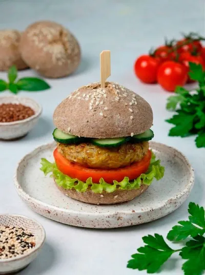 Порадуйте себя в выходные вкусным домашним вегабургером! 🍔 Мы уже показали, что из смеси «Вегафарш» можно приготовить сочные котлеты. Давайте добавим к ним мягкую булочку, чтобы получился настоящий