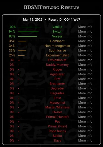 Sima🏳️🌈Deni и Квир в изгнании прошли древнючий тест на кинки для БДСМщиков. Впервые я его проходил где-то в 2012 году и не особо помню, какой был тогда результат. Но точно помню, что «ваниль» так ж
