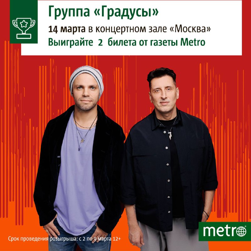 Разыгрываем билеты на концерт группы «Градусы» 14 марта в КЗ «Москва»! ✅ Подписывайтесь на телеграм-канал «Мetro Москва» и жмите на кнопку «Участвовать» под конкурсным постом! 🥳 Победитель будет в