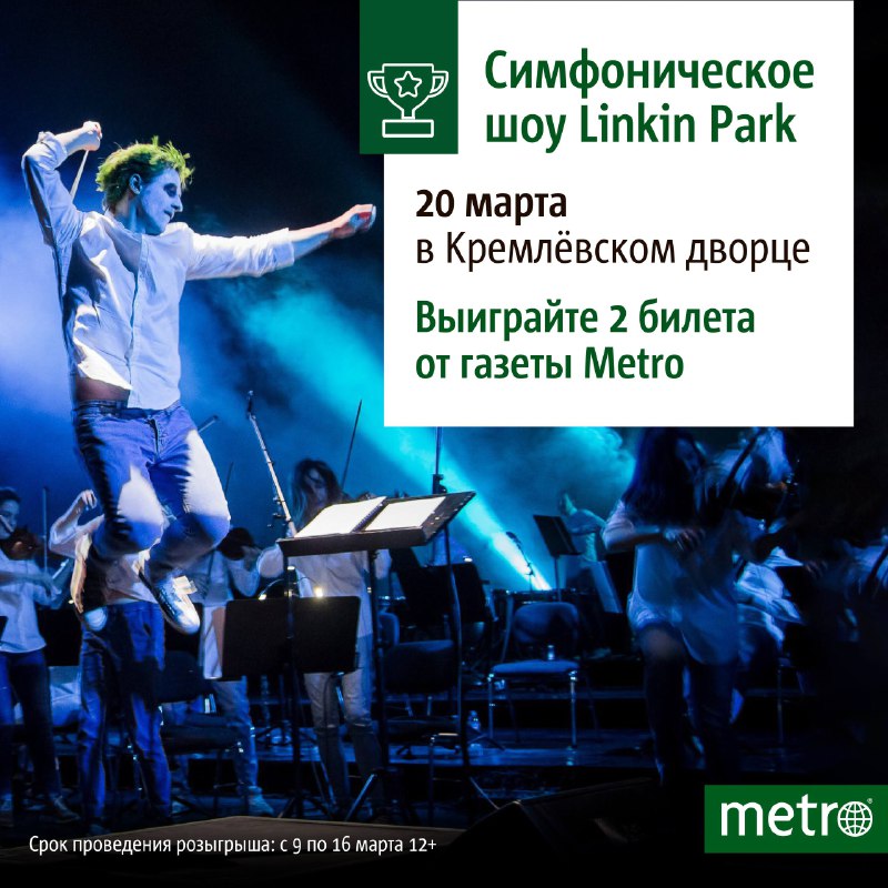 Разыгрываем билеты на симфонический концерт «Linkin Park» — симфоническое шоу с голосом Честера Беннингтона» в Государственном Кремлевском Дворце 20 марта! ✅ Подписывайтесь на телеграм-канал «Мetro