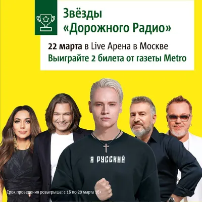 Разыгрываем билеты на концерт «Звезды Дорожного Радио» в «Live Арена» 22 марта! ✅ Подписывайтесь на телеграм-канал «Мetro Москва» и жмите на кнопку «Участвовать» под конкурсным постом! 🥳 Победител