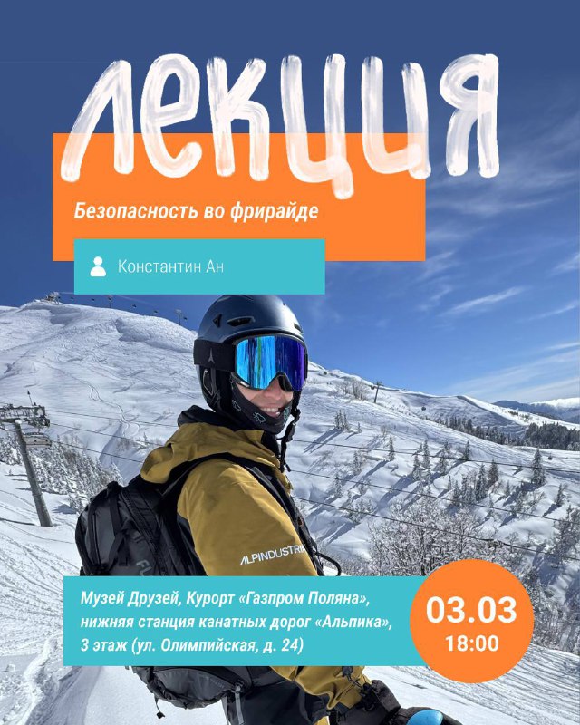 Лекция в Музее Друзей 🔹 🕘 3 МАРТА🔹18:00 Лекция Константина Ана на тему: «Безопасность во фрирайде» На встрече вы узнаете: 🔹Основы лавинной опасности 🔹Какое снаряжение необходимо возить с собо