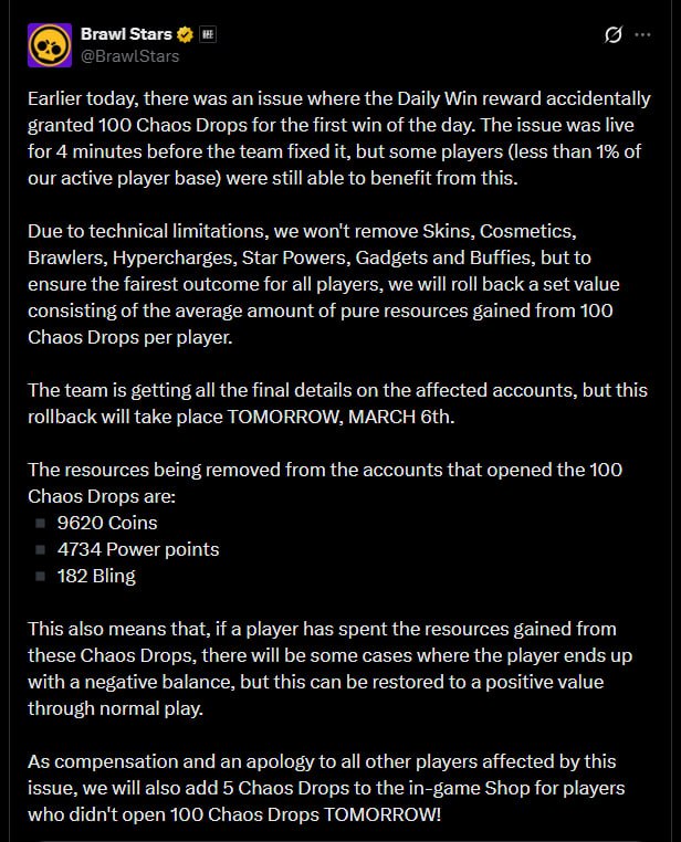 😄😄😄 ОТКАТ ТЕХ КТО ОТКРЫЛ 100 ХАОС ДРОПОВ Откат произойдет ЗАВТРА, 6 МАРТА. У игроков, открывших 100 Хаос-дропов, будут изъяты следующие ресурсы: — 9620 монет — 4734 очка силы — 182 блинга Завтра