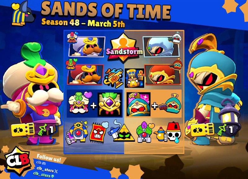 ⚡️ Новый сезон Brawl Pass Завтра в Brawl Stars начинается новый сезон Brawl Pass под названием «Пески Времени». Он будет включать в себя два новых скина с расцветками, кучу косметики и титул: — Песч